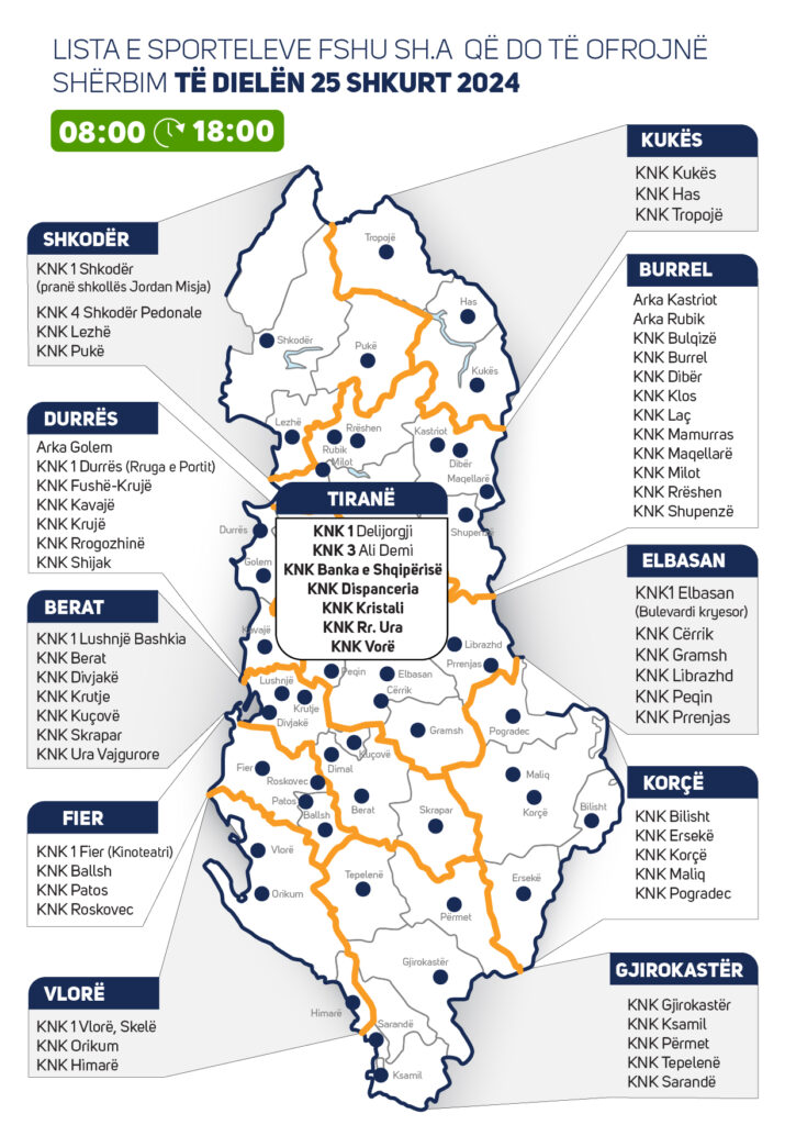 Në vijim do të gjeni hartën me qytetet dhe adresat e sporteleve që do të ofrojnë shërbim ditën e dielë, 25 shkurt, ora 08:00-16:00.