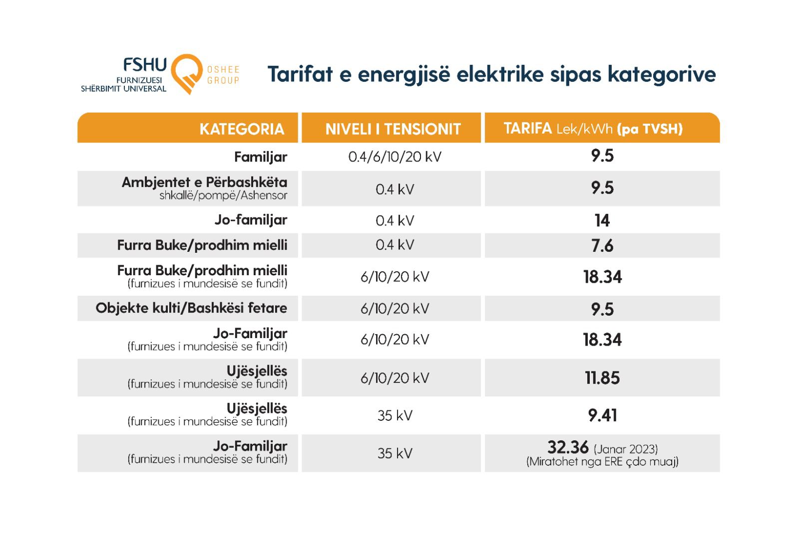 2. Miratimin e cmimit të shitjes së energjisë elektrike të furnizuar nga Furnizuesi i Mundësisë së Fundit për muajin janar 2023 prej 32.27 lek/kilovat për klientët e lidhur në nivelin e tensionit 35kV si dhe për periudhën 1 janar-31 dhjetor 2023, prej 18.26 lek/kilovat për klientët e lidhur në nivelin e tensionit 20/10/6 Kw.